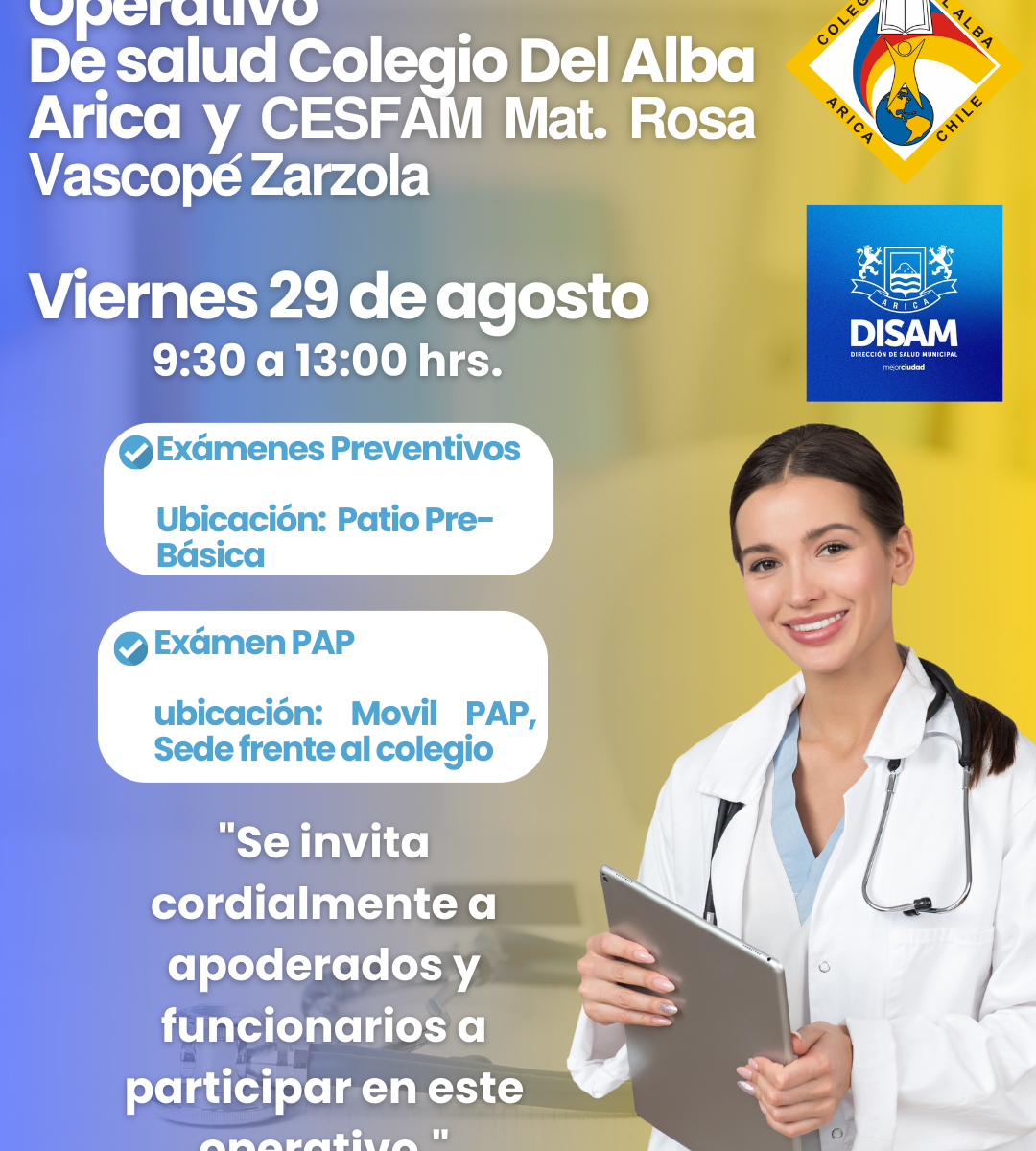 Junto con saludar, se informa que para este viernes 29 de agosto del mes en curso, en nuestro colegio se realizara un operativo de salud en coordinación con el Cesfam Rosa Vascope Z., cuyo fin es acercar la red de salud primaria a nuestros funcionarios y apoderados.