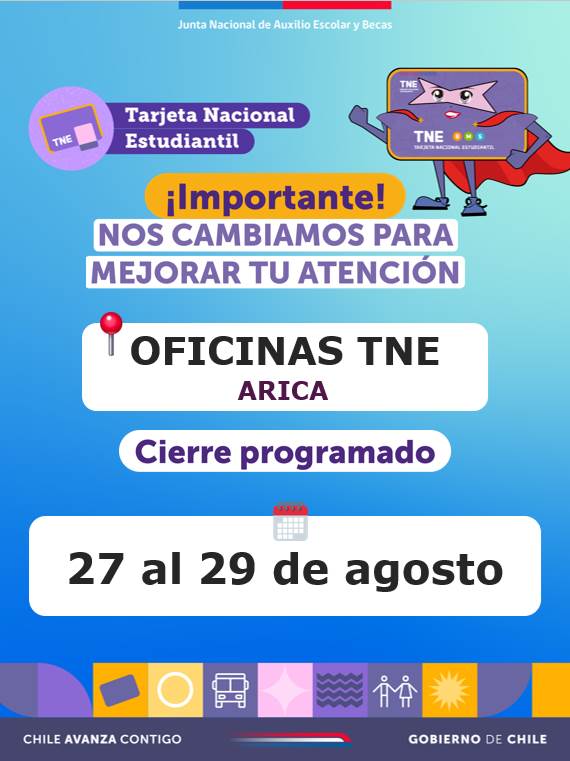 Cierre programado de atención al público: Módulo TNE Arica CERRADO desde el 28 al 29 de agosto de 2025.